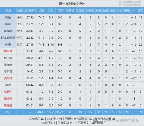 此役库里18投7中,三分10中3,罚球9中9,砍下26分2篮板7助攻4抢断,正负值+16。库里生涯总得分追平皮尔斯(26397)并列历史第19,再往前一位是邓肯(26496分)。上半场打完,勇士领先1分,第三节勇士38-17单节净胜21分。